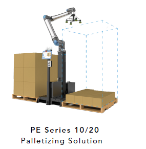 The PE Series is a pre-engineered palletizing system designed for straightforward deployment and dependable operation. Built around a pedestal-mounted collaborative robot, it is ideal for operations that need a compact footprint without sacrificing performance. Palletising solutions like this support both scalability and adaptability on site.